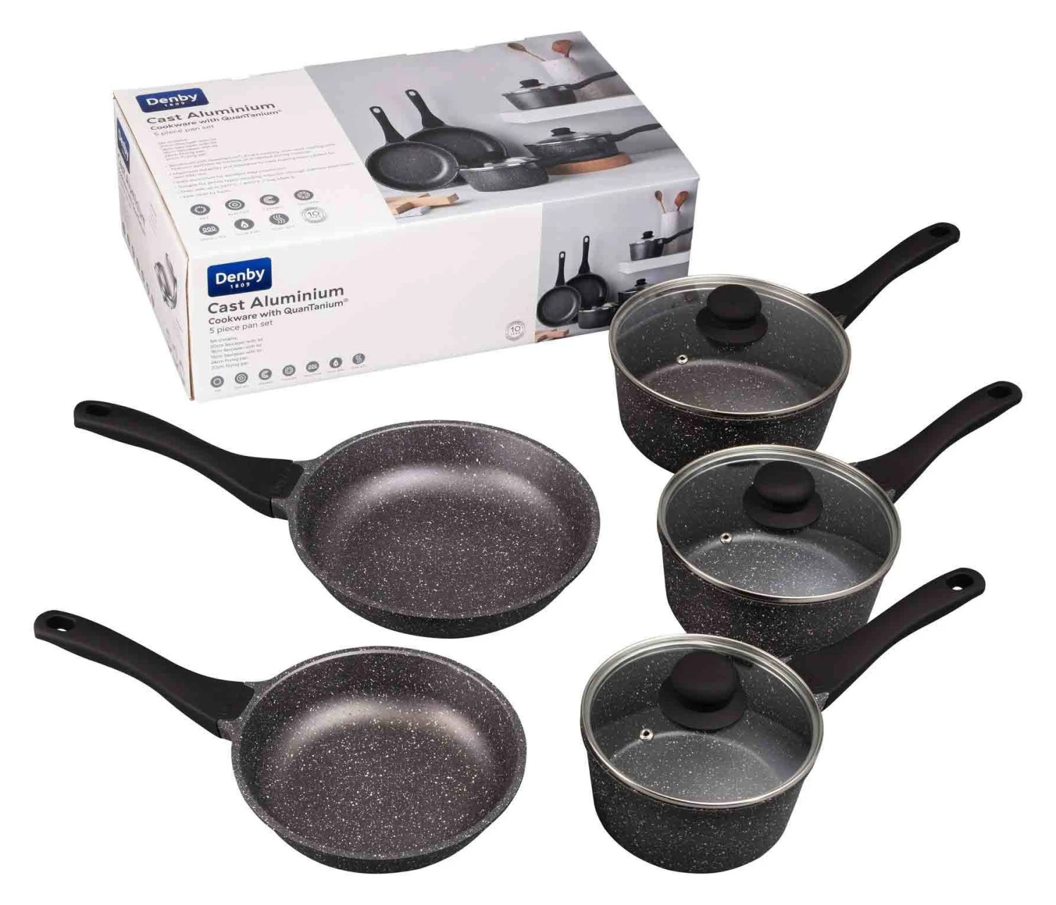 The Denby Granite Finish Cast Aluminium 5 Piece Pan Set contains: 20cm Saucepan with lid, 18cm Saucepan with lid, 16cm Saucepan with lid, 24cm Frying Pan and a 20cm Frying Pan.