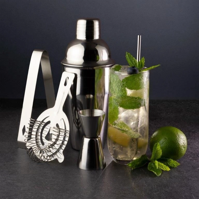 - Set Contains: Shaker, Strainer, Double Jigger 25/40ml, Ice Tongs and Mixing Spoon